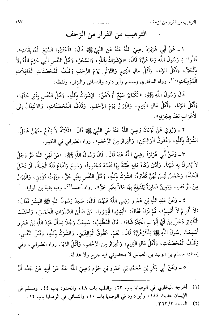 رَوَاهُ البُخَارِيّ وَمُسلم وَأَبُو دَاوُد وَالنَّسَائِيّ وَالْبَزَّار وَلَفظه قَالَ رَسُول الله صلى الله عَلَيْهِ وَسلم الْكَبَائِر سبع أولَاهُنَّ الْإِشْرَاك بِاللَّه وَقتل النَّفس بِغَيْر حَقّهَا وَأكل الرِّبَا وَأكل مَال الْيَتِيم والفرار يَوْم الزَّحْف وَقذف الْمُحْصنَات والانتقال إِلَى الْأَعْرَاب بعد هجرته