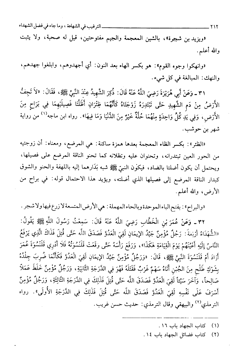 2138 - وَعَن عمر بن الْخطاب رَضِي الله عَنهُ قَالَ سَمِعت رَسُول الله صلى الله عَلَيْهِ وَسلم يَقُول الشُّهَدَاء أَرْبَعَة رجل مُؤمن جيد الْإِيمَان لَقِي الْعَدو فَصدق الله حَتَّى قتل فَذَاك الَّذِي يرفع النَّاس إِلَيْهِ أَعينهم يَوْم الْقِيَامَة هَكَذَا وَرفع رَأسه حَتَّى وَقعت قلنسوته فَلَا أَدْرِي قلنسوة عمر أَرَادَ أم قلنسوة النَّبِي صلى الله عَلَيْهِ وَسلم قَالَ وَرجل مُؤمن جيد الْإِيمَان لَقِي الْعَدو فَكَأَنَّمَا ضرب جلده بشوك طلح من الْجُبْن أَتَاهُ سهم غرب فَقتله فَهُوَ فِي الدرجَة الثَّانِيَة وَرجل مُؤمن خلط عملا صَالحا وَآخر سَيِّئًا لَقِي الْعَدو فَصدق الله حَتَّى قتل فَذَلِك فِي الدرجَة الثَّالِثَة وَرجل مُؤمن أسرف على نَفسه لَقِي الْعَدو فَصدق الله حَتَّى قتل فَذَلِك فِي الدرجَة الأولى