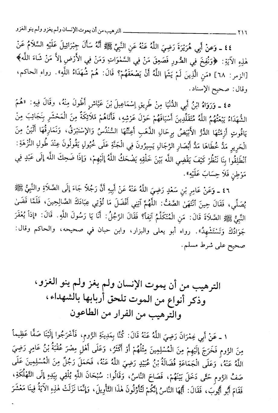 التَّرْهِيب من أَن يَمُوت الْإِنْسَان وَلم يغز وَلم ينْو الْغَزْو وَذكر أَنْوَاع من الْمَوْت تلْحق أَرْبَابهَا بِالشُّهَدَاءِ والترهيب من الْفِرَار من الطَّاعُون