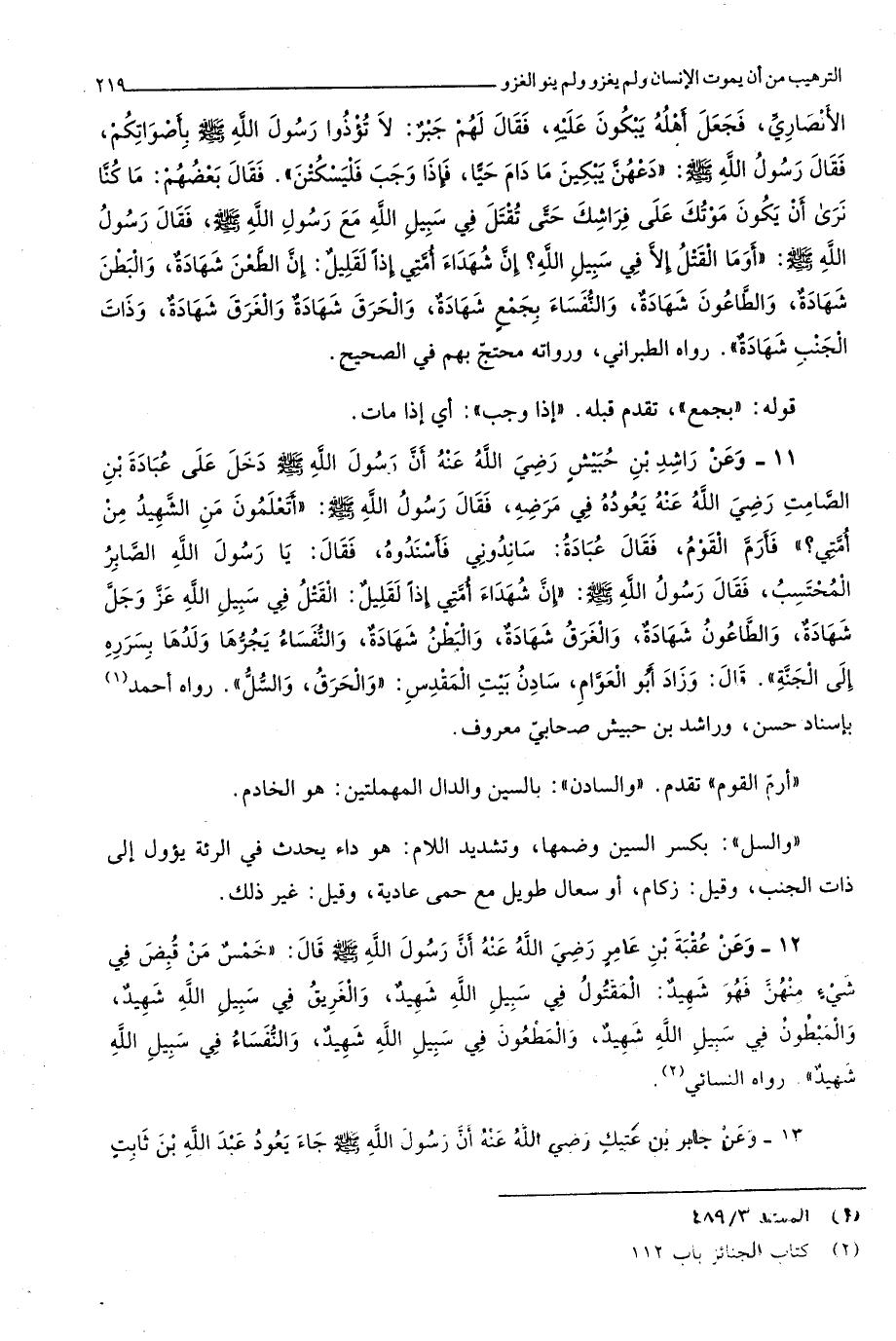 2163 - وَعَن رَاشد بن حُبَيْش رَضِي الله عَنهُ أَن رَسُول الله صلى الله عَلَيْهِ وَسلم دخل على عبَادَة بن الصَّامِت رَضِي الله عَنهُ يعودهُ فِي مَرضه فَقَالَ رَسُول الله صلى الله عَلَيْهِ وَسلم أتعلمون من الشَّهِيد من أمتِي فأرم الْقَوْم فَقَالَ عبَادَة ساندوني فَأَسْنَدُوهُ فَقَالَ يَا رَسُول الله الصابر الْمُحْتَسب فَقَالَ رَسُول الله صلى الله عَلَيْهِ وَسلم إِن شُهَدَاء أمتِي إِذا لقَلِيل الْقَتْل فِي سَبِيل الله عز وَجل شَهَادَة والطاعون شَهَادَة وَالْغَرق شَهَادَة والبطن شَهَادَة وَالنُّفَسَاء يجرها وَلَدهَا بسرره إِلَى الْجنَّة