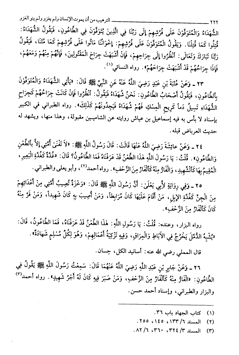 قلت يَا رَسُول الله هَذَا الطعْن قد عَرفْنَاهُ فَمَا الطَّاعُون قَالَ غُدَّة كَغُدَّة الْبَعِير الْمُقِيم بهَا كالشهيد والفار مِنْهُ كالفار من الزَّحْف