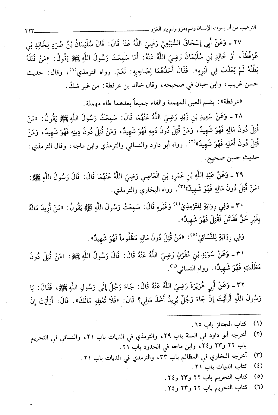 82 - وَعَن سعيد بن زيد رَضِي الله عَنْهُمَا قَالَ سَمِعت رَسُول الله صلى الله عَلَيْهِ وَسلم يَقُول من قتل دون مَاله فَهُوَ شَهِيد وَمن قتل دون دَمه فَهُوَ شَهِيد وَمن قتل دون دينه فَهُوَ شَهِيد وَمن قتل دون أَهله فَهُوَ شَهِيد