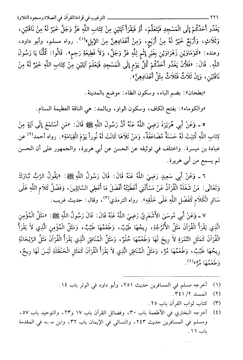 قَالَ أَفلا يَغْدُو أحدكُم إِلَى الْمَسْجِد فيتعلم أَو فَيقْرَأ آيَتَيْنِ من كتاب الله عز وَجل خير لَهُ من ناقتين وَثَلَاث وَأَرْبع خير لَهُ من أَربع وَمن أعدادهن من الْإِبِل