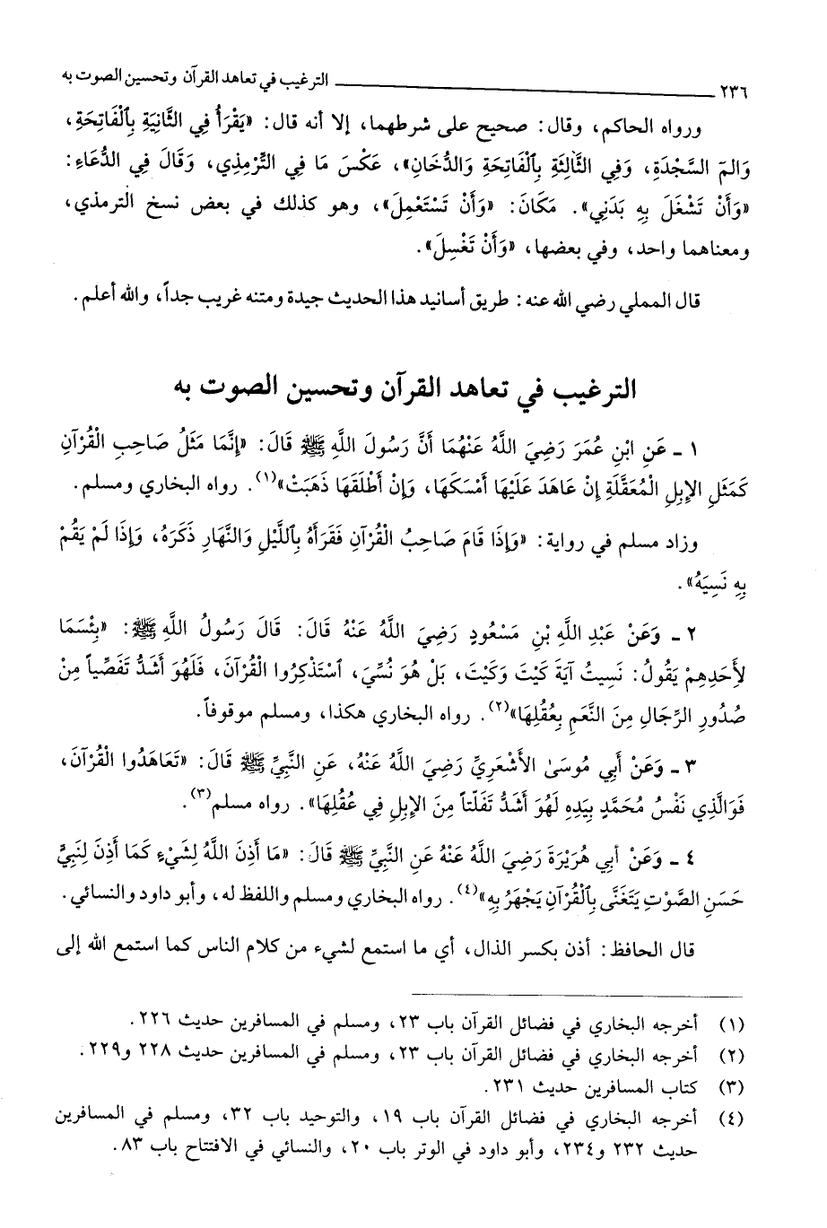 2227 - عَن ابْن عمر رَضِي الله عَنْهُمَا أَن رَسُول الله صلى الله عَلَيْهِ وَسلم قَالَ إِنَّمَا مثل صَاحب الْقُرْآن كَمثل الْإِبِل المعقلة إِن عَاهَدَ عَلَيْهَا أمْسكهَا وَإِن أطلقها ذهبت