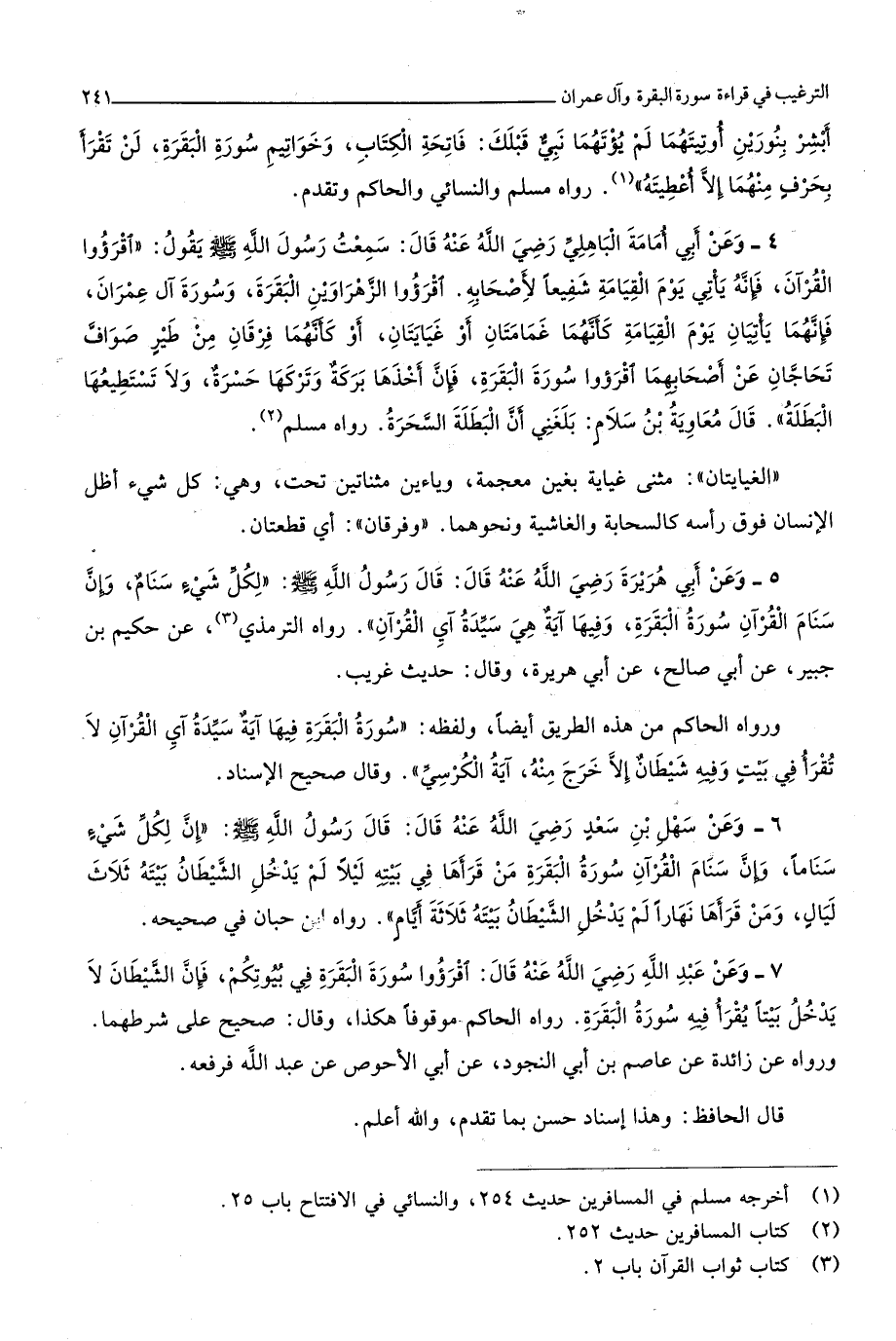 2248 - وَعَن سهل بن سعد رَضِي الله عَنهُ قَالَ قَالَ رَسُول الله صلى الله عَلَيْهِ وَسلم إِن لكل شَيْء سناما وَإِن سَنَام الْقُرْآن سُورَة الْبَقَرَة من قَرَأَهَا فِي بَيته لَيْلًا لم يدْخل الشَّيْطَان بَيته ثَلَاث لَيَال وَمن قَرَأَهَا نَهَارا لم يدْخل الشَّيْطَان بَيته ثَلَاثَة أَيَّام