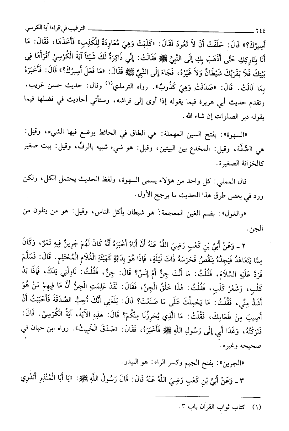 2258 - وَعَن أبي بن كَعْب رَضِي الله عَنهُ أَن أَبَاهُ أخبرهُ أَنه كَانَ لَهُم جرين فِيهِ تمر وَكَانَ مِمَّا يتَعَاهَد فيجده ينقص فحرسه ذَات لَيْلَة فَإِذا هُوَ بِدَابَّة كَهَيئَةِ الْغُلَام المحتلم