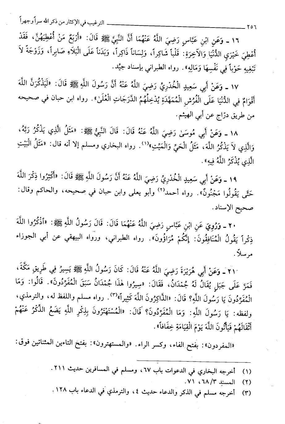 رَوَاهُ مُسلم وَاللَّفْظ لَهُ وَالتِّرْمِذِيّ وَلَفظه يَا رَسُول الله وَمَا المفردون قَالَ المستهترون بِذكر الله يضع الذّكر عَنْهُم أثقالهم فَيَأْتُونَ الله يَوْم الْقِيَامَة خفافا