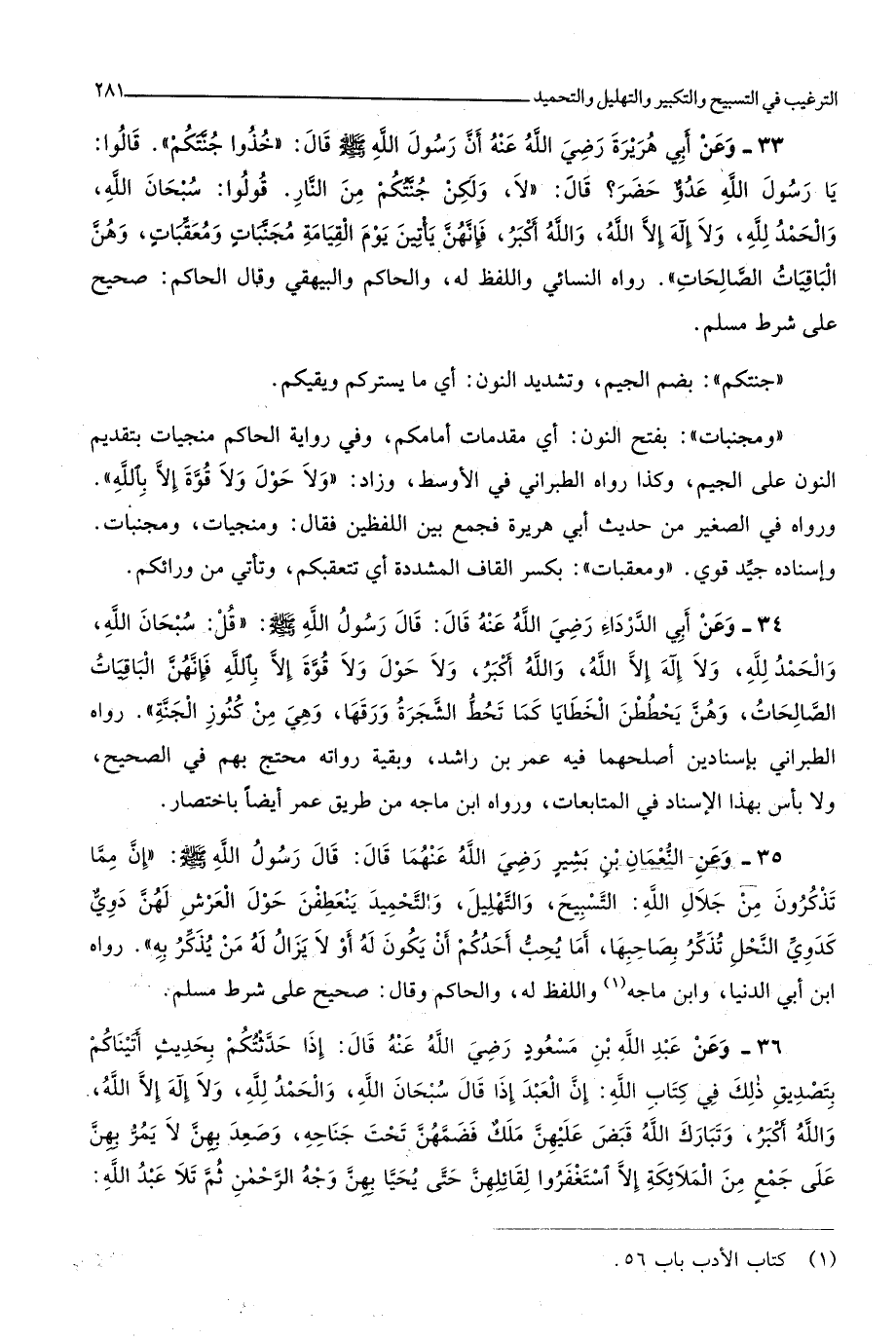 قُولُوا سُبْحَانَ الله وَالْحَمْد لله وَلَا إِلَه إِلَّا الله وَالله أكبر فَإِنَّهُنَّ يَأْتِين يَوْم الْقِيَامَة مجنبات ومعقبات وَهن الْبَاقِيَات الصَّالِحَات