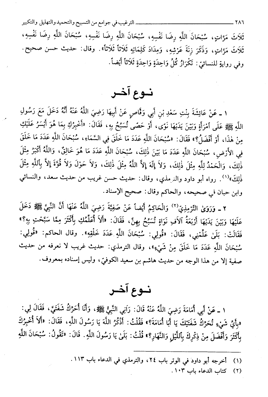 2425 - وروى التِّرْمِذِيّ وَالْحَاكِم أَيْضا عَن صَفِيَّة رَضِي الله عَنْهَا أَن النَّبِي صلى الله عَلَيْهِ وَسلم دخل عَلَيْهَا وَبَين يَديهَا أَرْبَعَة آلَاف نواة تسبح بِهن فَقَالَ أَلا أعلمك بِأَكْثَرَ مِمَّا سبحت بِهِ فَقَالَت بلَى عَلمنِي فَقَالَ قولي سُبْحَانَ الله عدد خلقه