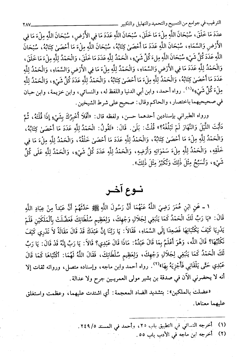 2427 - عَن ابْن عمر رَضِي الله عَنْهُمَا أَن رَسُول الله صلى الله عَلَيْهِ وَسلم حَدثهمْ أَن عبدا من عباد الله قَالَ يَا رب لَك الْحَمد كَمَا يَنْبَغِي لجلال وَجهك ولعظيم سلطانك فعضلت بالملكين فَلم يدريا كَيفَ يكتبانها فصعدا إِلَى السَّمَاء فَقَالَا يَا رَبنَا إِن عَبدك قد قَالَ مقَالَة لَا نَدْرِي كَيفَ نكتبها قَالَ الله وَهُوَ أعلم بِمَا قَالَ عَبده مَاذَا قَالَ عَبدِي قَالَا يَا رب إِنَّه قد قَالَ يَا رب لَك الْحَمد كَمَا يَنْبَغِي لجلال وَجهك ولعظيم سلطانك فَقَالَ الله لَهما اكتباها كَمَا قَالَ عَبدِي حَتَّى يلقاني فأجزيه بهَا