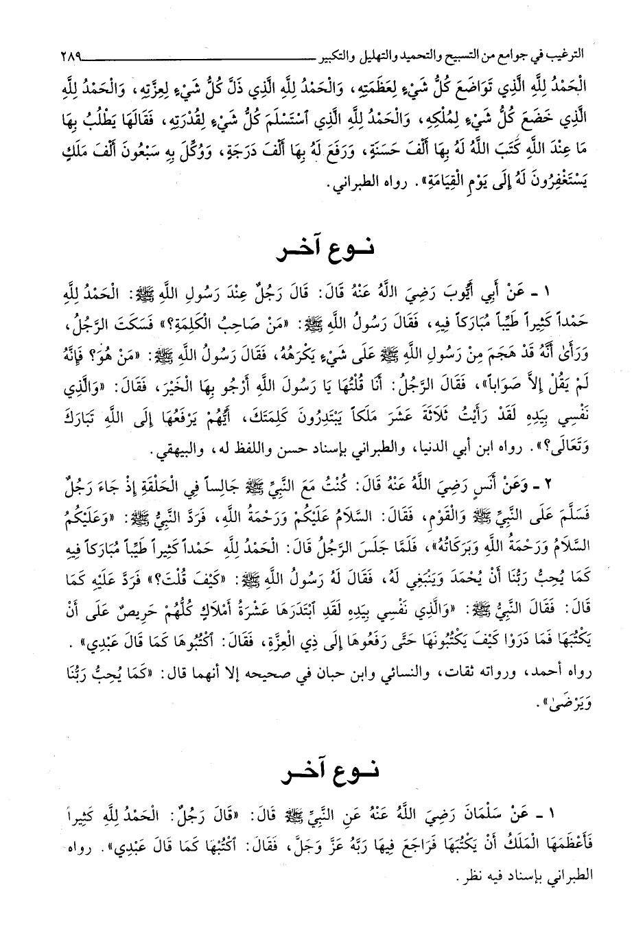 الْحَمد لله الَّذِي تواضع كل شَيْء لعظمته وَالْحَمْد لله الَّذِي ذل كل شَيْء لعزته وَالْحَمْد لله الَّذِي خضع كل شَيْء لملكه وَالْحَمْد لله الَّذِي استسلم كل شَيْء لقدرته فَقَالَهَا يطْلب بهَا مَا عِنْد الله كتب الله لَهُ بهَا ألف حَسَنَة وَرفع لَهُ بهَا ألف دَرَجَة ووكل بِهِ سَبْعُونَ ألف ملك يَسْتَغْفِرُونَ لَهُ إِلَى يَوْم الْقِيَامَة