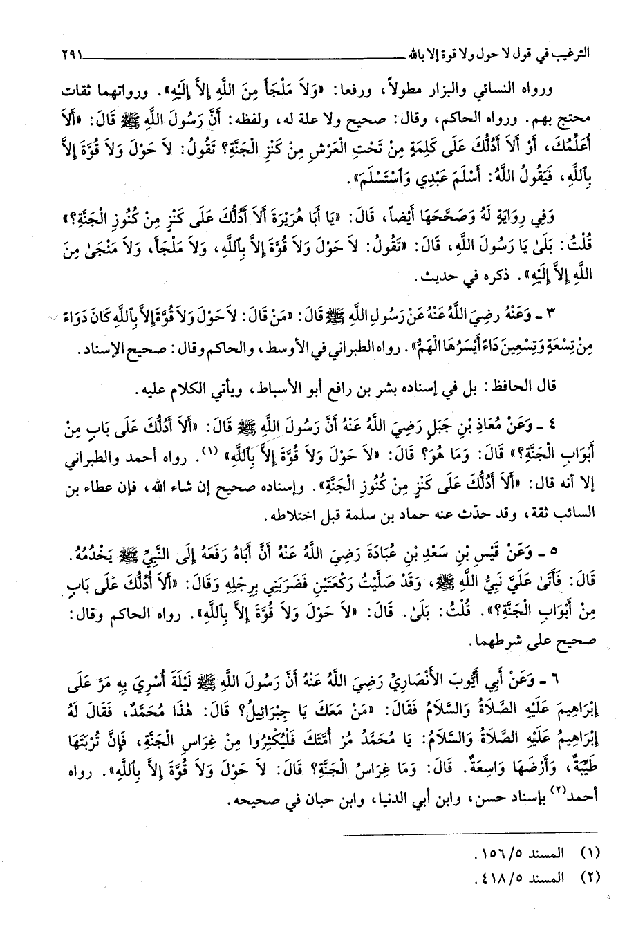 وَفِي رِوَايَة لَهُ وصححها أَيْضا قَالَ يَا أَبَا هُرَيْرَة أَلا أدلك على كنز من كنوز الْجنَّة قلت بلَى يَا رَسُول الله قَالَ تَقول لَا حول وَلَا قُوَّة إِلَّا بِاللَّه وَلَا ملْجأ وَلَا منجى من الله إِلَّا إِلَيْهِ