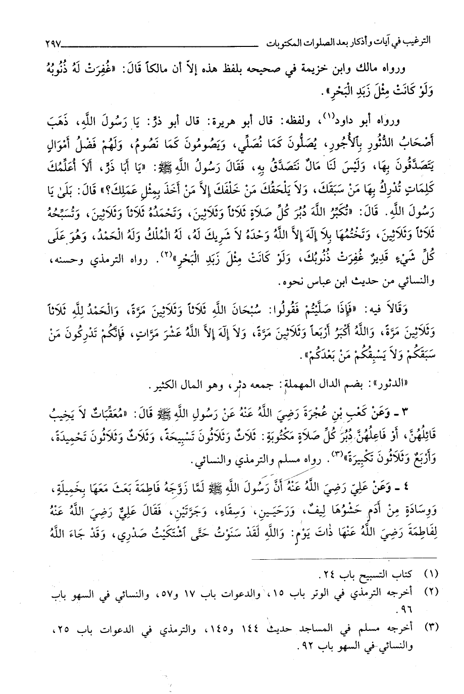 قَالَ تكبر الله دبر كل صَلَاة ثَلَاثًا وَثَلَاثِينَ وَتَحْمَدهُ ثَلَاثًا وَثَلَاثِينَ وتسبحه ثَلَاثًا وَثَلَاثِينَ وتختمها بِلَا إِلَه إِلَّا الله وَحده لَا شريك لَهُ لَهُ الْملك وَله الْحَمد وَهُوَ على كل شَيْء قدير غفرت ذنوبك وَلَو كَانَت مثل زبد الْبَحْر