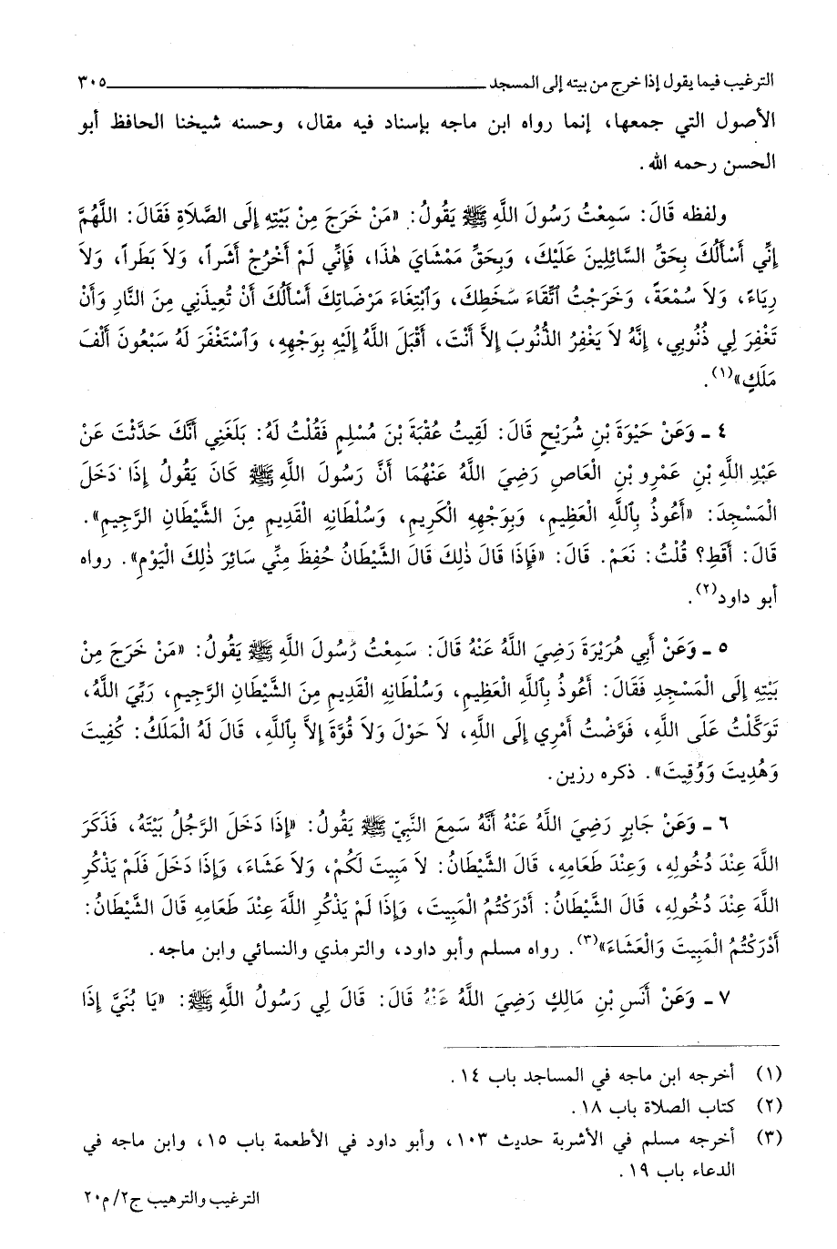 وَلَفظه قَالَ سَمِعت رَسُول الله صلى الله عَلَيْهِ وَسلم يَقُول من خرج من بَيته إِلَى الصَّلَاة فَقَالَ اللَّهُمَّ إِنِّي أَسأَلك بِحَق السَّائِلين عَلَيْك وبحق ممشاي هَذَا فَإِنِّي لم أخرج أشرا وَلَا بطرا وَلَا رِيَاء وَلَا سمعة وَخرجت اتقاء سخطك وابتغاء مرضاتك أَسأَلك أَن تعيذني من النَّار وَأَن تغْفر لي ذُنُوبِي إِنَّه لَا يغْفر الذُّنُوب إِلَّا أَنْت أقبل الله إِلَيْهِ بِوَجْهِهِ واستغفر لَهُ سَبْعُونَ ألف ملك