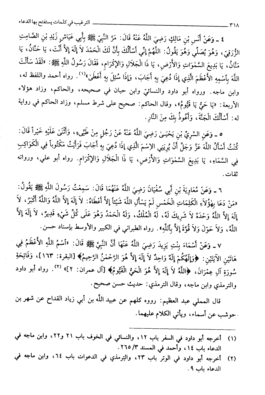 وَرَوَاهُ أَبُو دَاوُد وَالنَّسَائِيّ وَابْن حبَان فِي صَحِيحه وَالْحَاكِم وَزَاد هَؤُلَاءِ الْأَرْبَعَة يَا حَيّ يَا قيوم وَقَالَ الْحَاكِم صَحِيح على شَرط مُسلم وَزَاد الْحَاكِم فِي رِوَايَة لَهُ أَسأَلك الْجنَّة وَأَعُوذ بك من النَّار