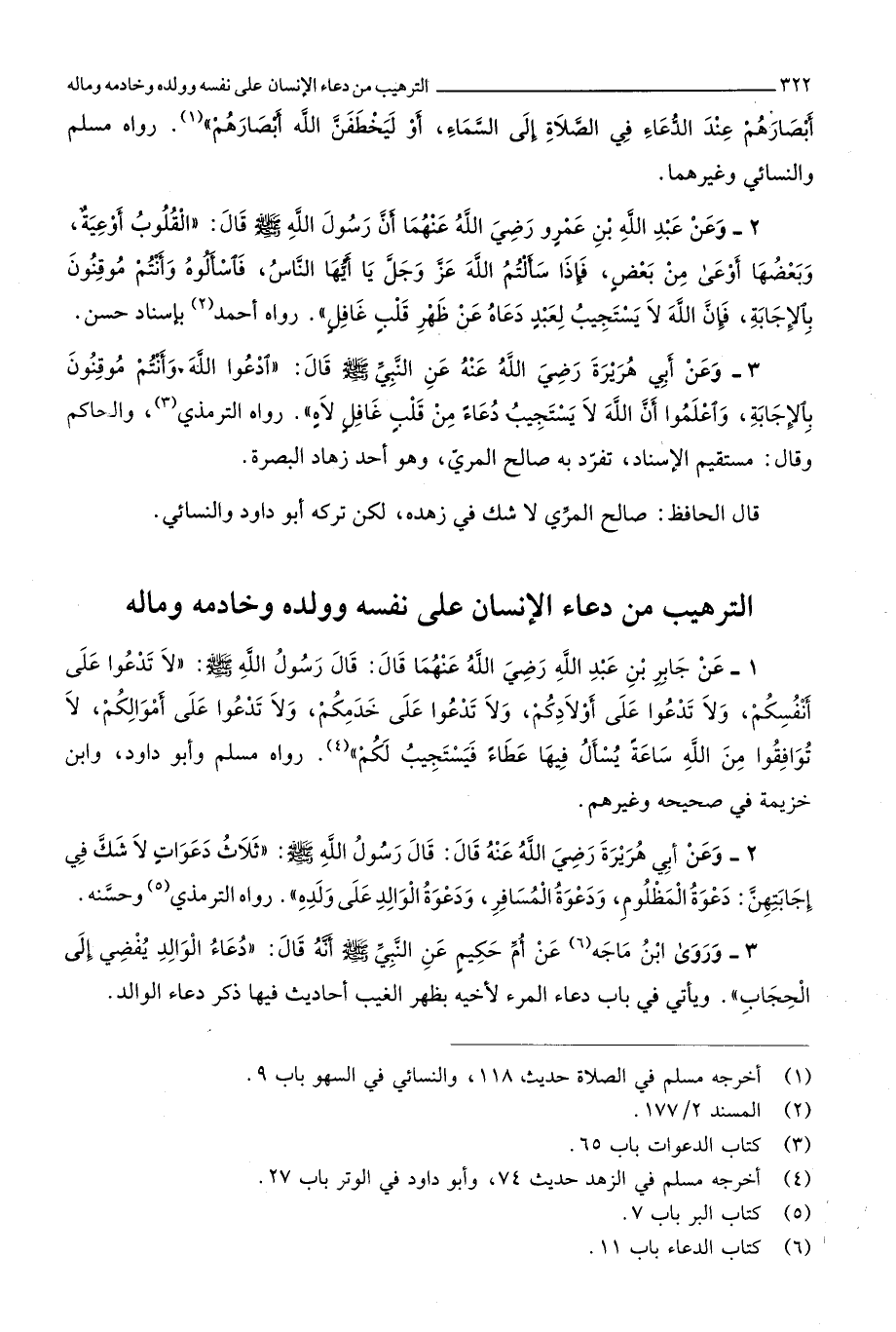 التَّرْهِيب من دُعَاء الْإِنْسَان على نَفسه وَولده وخادمه وَمَاله 1 عَن جَابر بن عبد الله رَضِي الله عَنْهُمَا قَالَ قَالَ رَسُول الله صلى الله عَلَيْهِ وَسلم لَا تدعوا على أَنفسكُم وَلَا تدعوا على أَوْلَادكُم وَلَا تدعوا على خدمكم وَلَا تدعوا على أَمْوَالكُم لَا توافقوا من الله سَاعَة يسْأَل فِيهَا عَطاء فيستجيب لكم