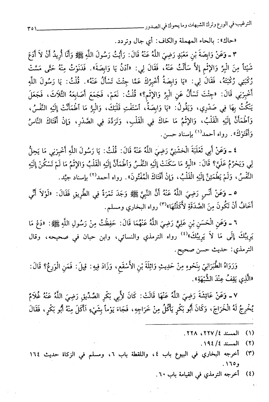 قلت يَا رَسُول الله أَخْبرنِي قَالَ جِئْت تسْأَل عَن الْبر وَالْإِثْم قلت نعم فَجمع أَصَابِعه الثَّلَاث فَجعل ينكت بهَا فِي صَدْرِي وَيَقُول يَا وابصة استفت قَلْبك وَالْبر مَا اطمأنت إِلَيْهِ النَّفس وَاطْمَأَنَّ إِلَيْهِ الْقلب وَالْإِثْم مَا حاك فِي الْقلب وَتردد فِي الصَّدْر وَإِن أَفْتَاك النَّاس وأفتوك