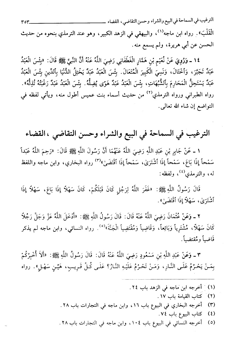 2695 - عَن جَابر بن عبد الله رَضِي الله عَنْهُمَا أَن رَسُول الله صلى الله عَلَيْهِ وَسلم قَالَ رحم الله عبدا سَمحا إِذا بَاعَ سَمحا إِذا اشْترى سَمحا إِذا اقْتضى رَوَاهُ البُخَارِيّ وَابْن مَاجَه وَاللَّفْظ لَهُ وَالتِّرْمِذِيّ وَلَفظه قَالَ رَسُول الله صلى الله عَلَيْهِ وَسلم غفر الله لرجل كَانَ قبلكُمْ كَانَ سهلا إِذا بَاعَ سهلا إِذا اشْترى سهلا إِذا اقْتضى