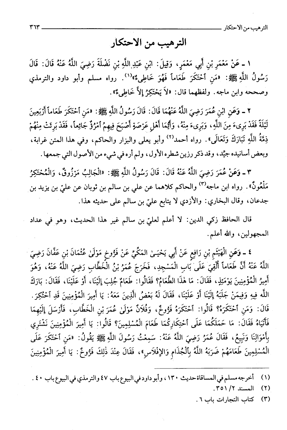 قَالَ وَمن احتكره قَالُوا احتكره فروخ وَفُلَان مولى عمر بن الْخطاب فَأرْسل إِلَيْهِمَا فَأتيَاهُ فَقَالَ مَا حملكما على احتكاركما طَعَام الْمُسلمين قَالُوا يَا أَمِير الْمُؤمنِينَ نشتري بِأَمْوَالِنَا ونبيع فَقَالَ عمر رَضِي الله عَنهُ سَمِعت رَسُول الله صلى الله عَلَيْهِ وَسلم يَقُول من احتكر على الْمُسلمين طعامهم ضربه الله بالجذام والإفلاس فَقَالَ عِنْد ذَلِك فروخ يَا أَمِير الْمُؤمنِينَ