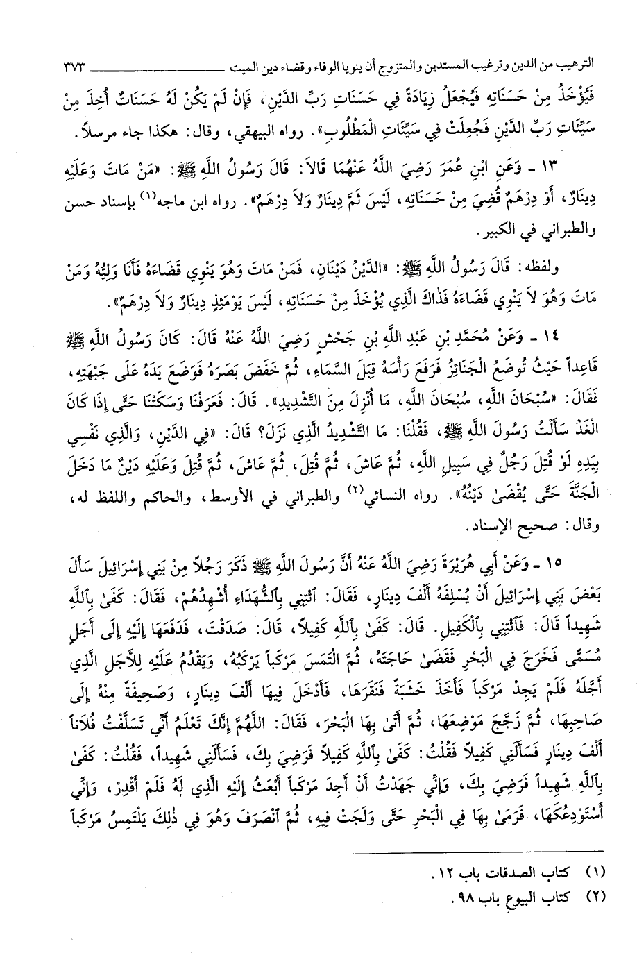 وَلَفظه قَالَ رَسُول الله صلى الله عَلَيْهِ وَسلم الدّين دينان فَمن مَاتَ وَهُوَ يَنْوِي قَضَاءَهُ فَأَنا وليه وَمن مَاتَ وَهُوَ لَا يَنْوِي قَضَاءَهُ فَذَاك الَّذِي يُؤْخَذ من حَسَنَاته لَيْسَ يَوْمئِذٍ دِينَار وَلَا دِرْهَم