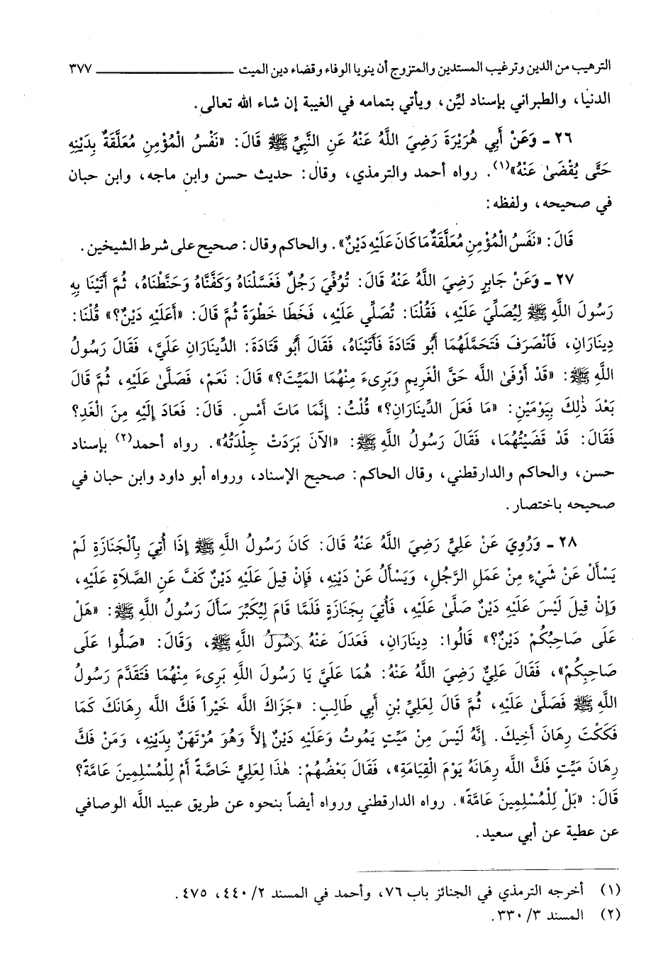 رَوَاهُ أَحْمد وَالتِّرْمِذِيّ وَقَالَ حَدِيث حسن وَابْن مَاجَه وَابْن حبَان فِي صَحِيحه وَلَفظه قَالَ نفس الْمُؤمن معلقَة مَا كَانَ عَلَيْهِ دين