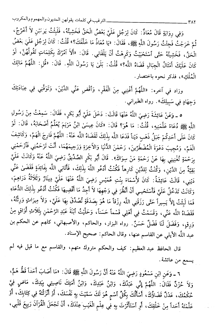 قَالَ أَلا آمُرك بِكَلِمَات تقولهن لَو كَانَ عَلَيْك أَمْثَال الْجبَال قَضَاهُ الله قلت بلَى يَا رَسُول الله