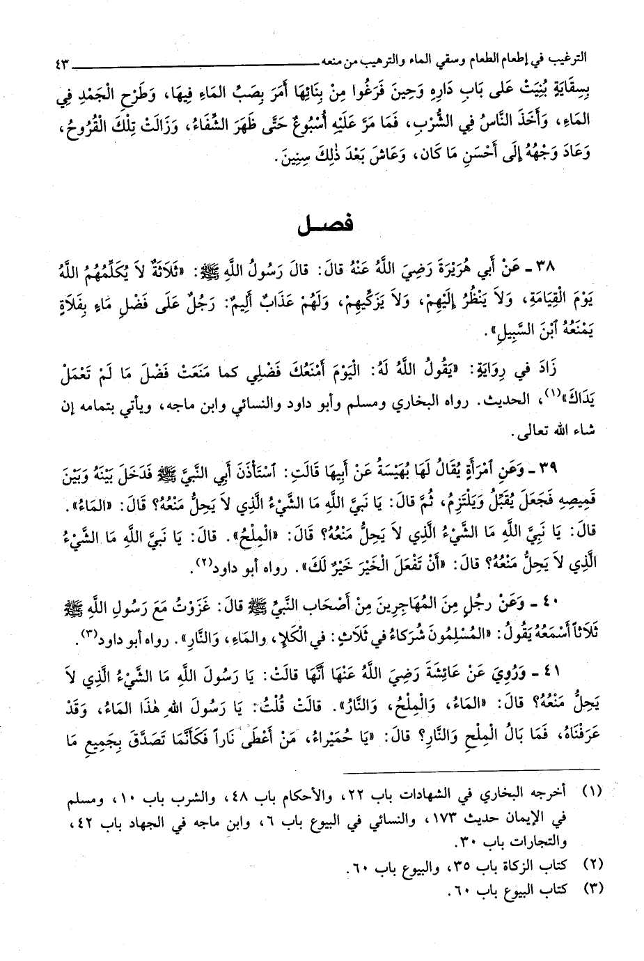 1427 - عَن أبي هُرَيْرَة رَضِي الله عَنهُ قَالَ قَالَ رَسُول الله صلى الله عَلَيْهِ وَسلم ثَلَاثَة لَا يكلمهم الله يَوْم الْقِيَامَة وَلَا ينظر إِلَيْهِم وَلَا يزكيهم وَلَهُم عَذَاب أَلِيم رجل على فضل مَاء بفلاة يمنعهُ ابْن السَّبِيل