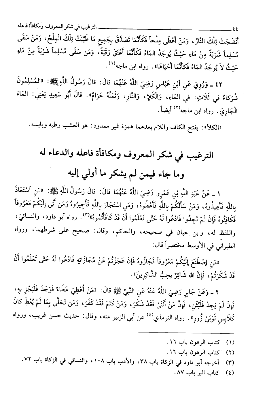 رَوَاهُ أَبُو دَاوُد وَالنَّسَائِيّ وَاللَّفْظ لَهُ وَابْن حبَان فِي صَحِيحه وَالْحَاكِم وَقَالَ صَحِيح على شَرطهمَا وَرَوَاهُ الطَّبَرَانِيّ فِي الْأَوْسَط مُخْتَصرا قَالَ من اصْطنع إِلَيْكُم مَعْرُوفا فجازوه فَإِن عجزتم عَن مجازاته فَادعوا لَهُ حَتَّى تعلمُوا أَن قد شكرتم فَإِن الله شَاكر يحب الشَّاكِرِينَ