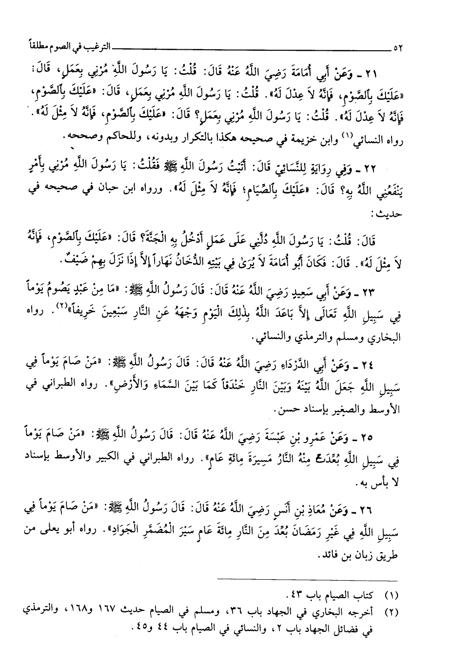 قلت يَا رَسُول الله مرني بِعَمَل قَالَ عَلَيْك بِالصَّوْمِ فَإِنَّهُ لَا مثل لَهُ