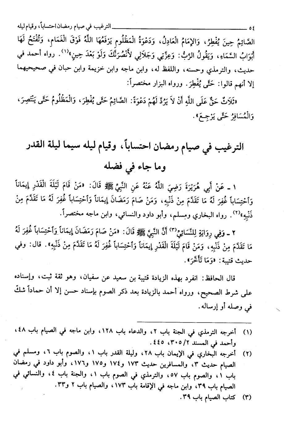 2 - التَّرْغِيب فِي صِيَام رَمَضَان احتسابا وَقيام ليله سِيمَا لَيْلَة الْقدر وَمَا جَاءَ فِي فَضله