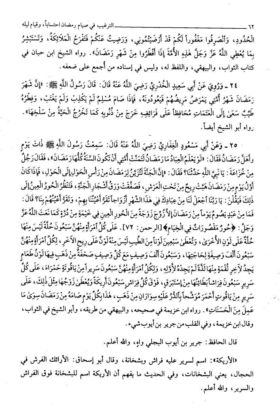 رَوَاهُ ابْن خُزَيْمَة فِي صَحِيحه وَالْبَيْهَقِيّ من طَرِيقه وَأَبُو الشَّيْخ فِي الثَّوَاب وَقَالَ ابْن خُزَيْمَة وَفِي الْقلب من جرير بن أَيُّوب شَيْء