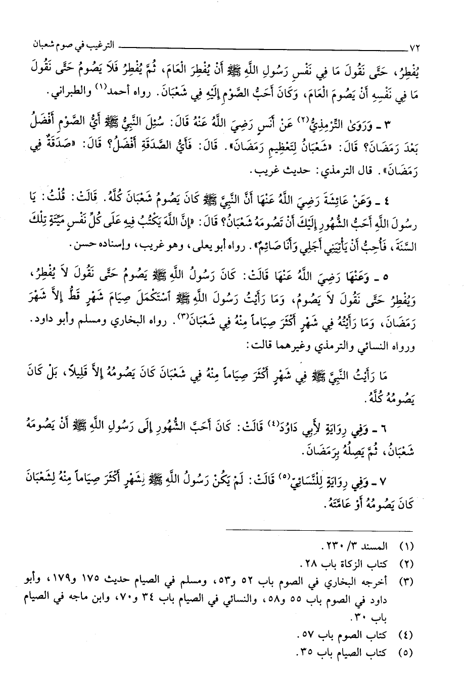 وَرَوَاهُ النَّسَائِيّ وَالتِّرْمِذِيّ وَغَيرهمَا قَالَت مَا رَأَيْت النَّبِي صلى الله عَلَيْهِ وَسلم فِي شهر أَكثر صياما مِنْهُ فِي شعْبَان كَانَ يَصُومهُ إِلَّا قَلِيلا بل كَانَ يَصُومهُ كُله