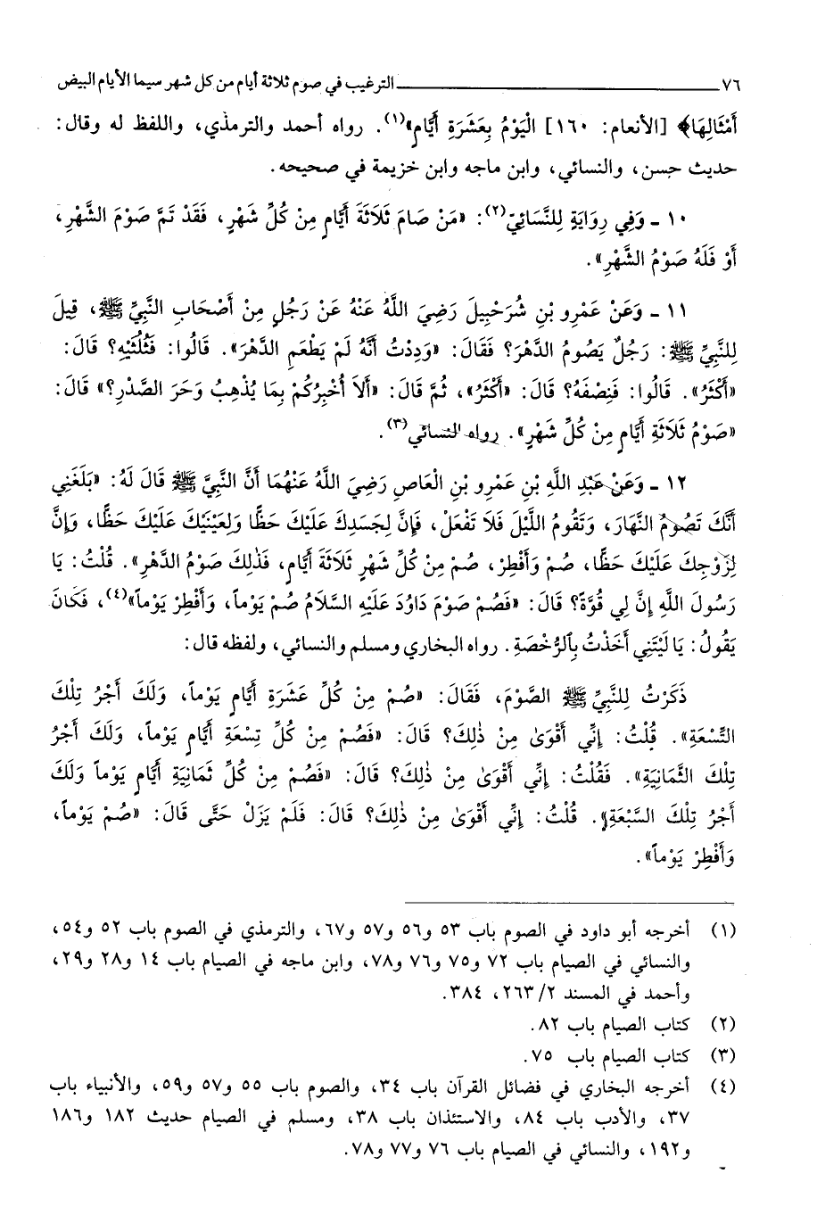 رَوَاهُ البُخَارِيّ وَمُسلم وَالنَّسَائِيّ وَلَفظه قَالَ ذكرت للنَّبِي صلى الله عَلَيْهِ وَسلم الصَّوْم فَقَالَ صم من كل عشرَة أَيَّام يَوْمًا وَلَك أجر تِلْكَ التِّسْعَة