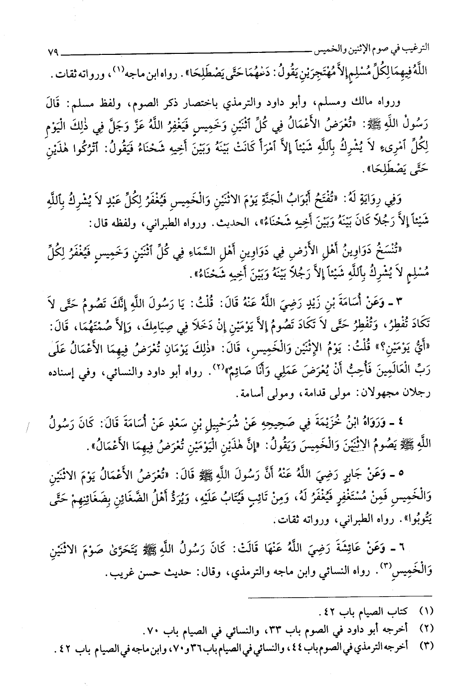 وَرَوَاهُ مَالك وَمُسلم وَأَبُو دَاوُد وَالتِّرْمِذِيّ بِاخْتِصَار ذكر الصَّوْم وَلَفظ مُسلم قَالَ رَسُول الله صلى الله عَلَيْهِ وَسلم تعرض الْأَعْمَال فِي كل اثْنَيْنِ وخميس فَيغْفر الله عز وَجل فِي ذَلِك الْيَوْم لكل امرىء لَا يُشْرك بِاللَّه شَيْئا إِلَّا امْرأ كَانَت بَينه وَبَين أَخِيه شَحْنَاء فَيَقُول اتْرُكُوا هذَيْن حَتَّى يصطلحا