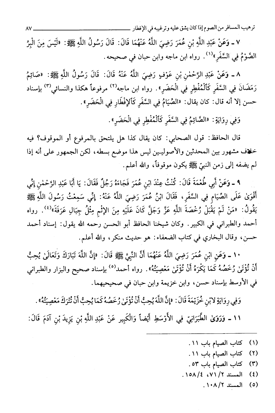 1608 - وَعَن أبي طعمة قَالَ كنت عِنْد ابْن عمر فَجَاءَهُ رجل فَقَالَ يَا أَبَا عبد الرَّحْمَن إِنِّي أقوى على الصّيام فِي السّفر فَقَالَ ابْن عمر رَضِي الله عَنهُ إِنِّي سَمِعت رَسُول الله صلى الله عَلَيْهِ وَسلم يَقُول من لم يقبل رخصَة الله عز وَجل كَانَ عَلَيْهِ من الْإِثْم مثل جبال عَرَفَة