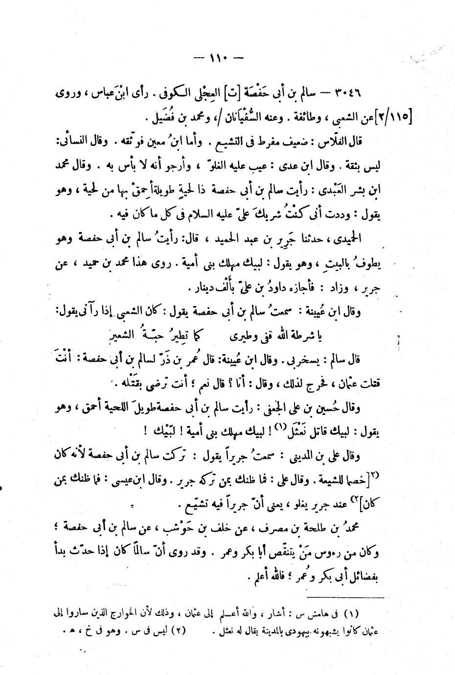 وقال حسين بن علي الجعفي: رأيت سالم بن أبي حفصة طويل اللحية أحمق، وهو يقول: لبيك قاتل نعثل (1) ! لبيك مهلك بنى أمية! لبيك! وقال علي بن المديني: سمعت جريرا يقول: تركت سالم بن أبي حفصة لانه كان (2 [خصما للشيعة.