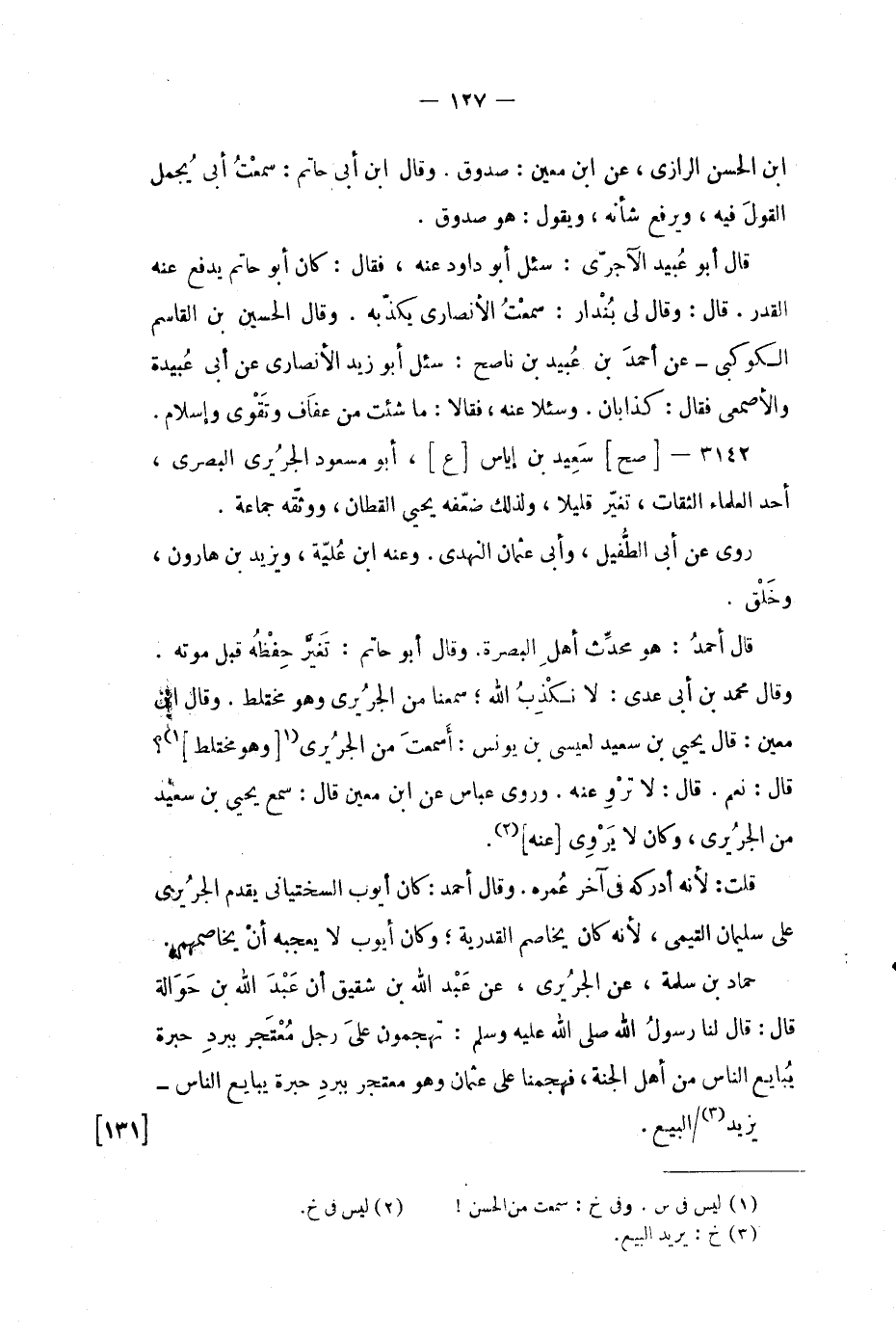 3142 -[صح] سعيد بن إياس [ع] ، أبو مسعود الجريري البصري، أحد العلماء الثقات، تغير قليلا، ولذلك ضعفه يحيى القطان، ووثقه جماعة.