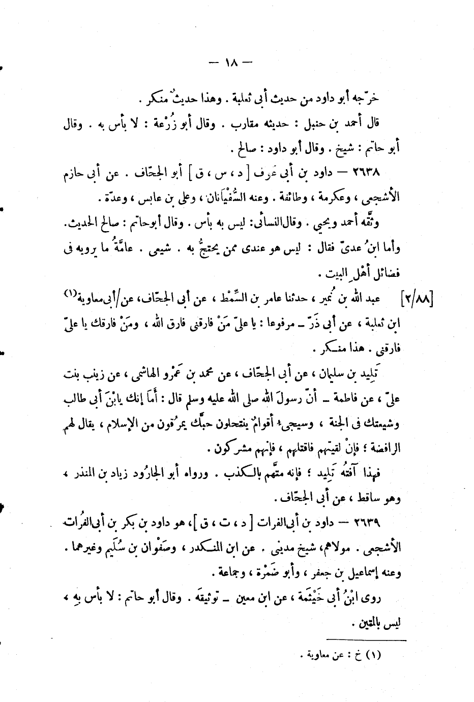 [88 / 2] عبد الله بن نمير، حدثنا عامر بن السمط، عن أبي الجحاف، عن / أبي معاوية (1) ابن ثعلبة، عن أبي ذر - مرفوعاً: يا علي من فارقني فارق الله، ومن فارقك يا علي فارقني.