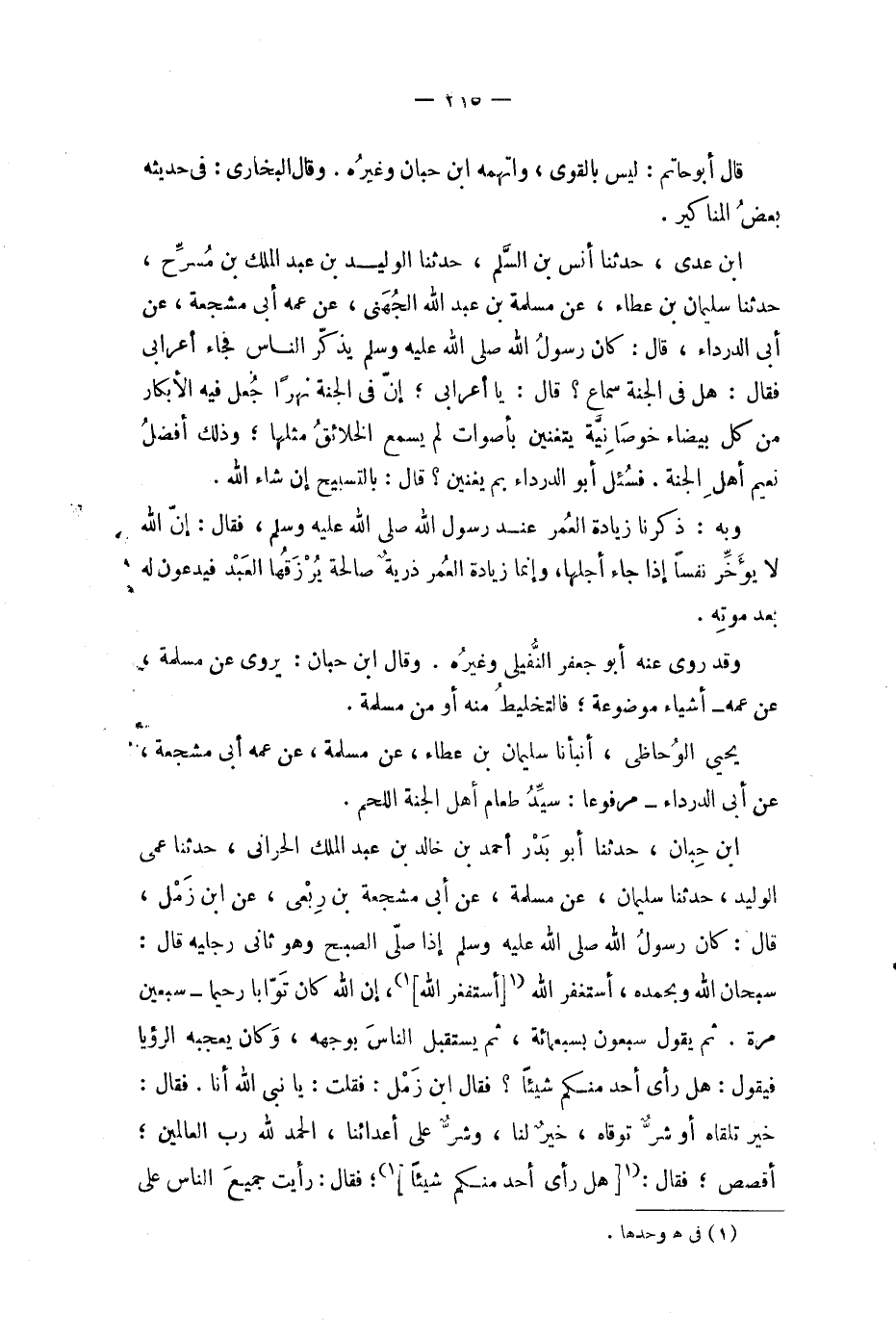 ابن عدي، حدثنا أنس بن السلم، حدثنا الوليد بن عبد الملك بن مسرح، حدثنا سليمان بن عطاء، عن مسلمة بن عبد الله الجهني، عن عمه أبي مشجعة، عن أبي الدرداء، قال: كان رسول الله صلى الله عليه وسلم يذكر الناس فجاء أعرابي فقال: هل في الجنة سماع؟ قال: يا أعرابي، إن في الجنة نهرا جعل فيه الابكار