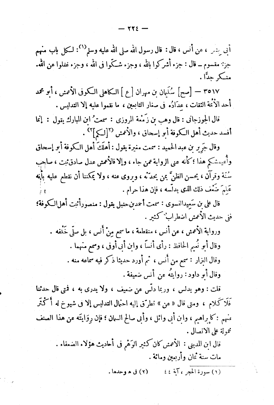 3517 -[صح] سليمان بن مهران [ع] الكاهلى الكوفي الأعمش، أبو محمد أحد الائمة الثقات، عداده في صغار التابعين، ما نقموا عليه إلا التدليس.