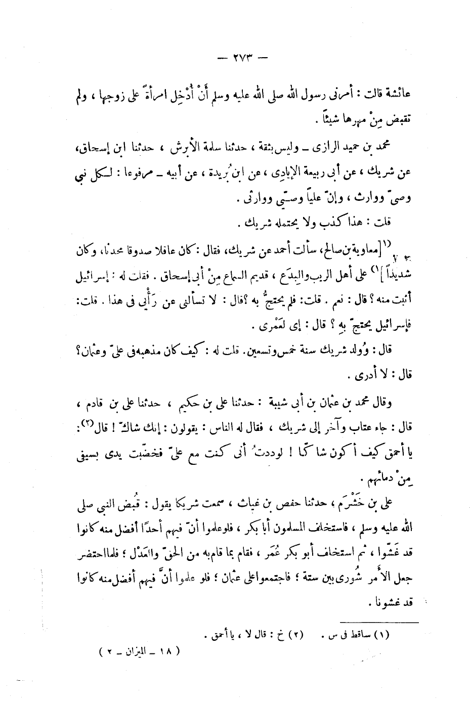 علي بن خشرم، حدثنا حفص بن غياث، سمعت شريكا يقول: قبض النبي صلى الله عليه وسلم، فاستخلف المسلمون أبا بكر، فلو علموا أن فيهم أحد أفضل منه كانوا قد غشوا، ثم استخلف أبو بكر عمر، فقال بما قام به من الحق والعدل، فلما احتضر جعل الامر شورى بين ستة، فاجتمعوا على عثمان، فلو علموا أن فيهم أفضل منه كانوا قد غشونا.