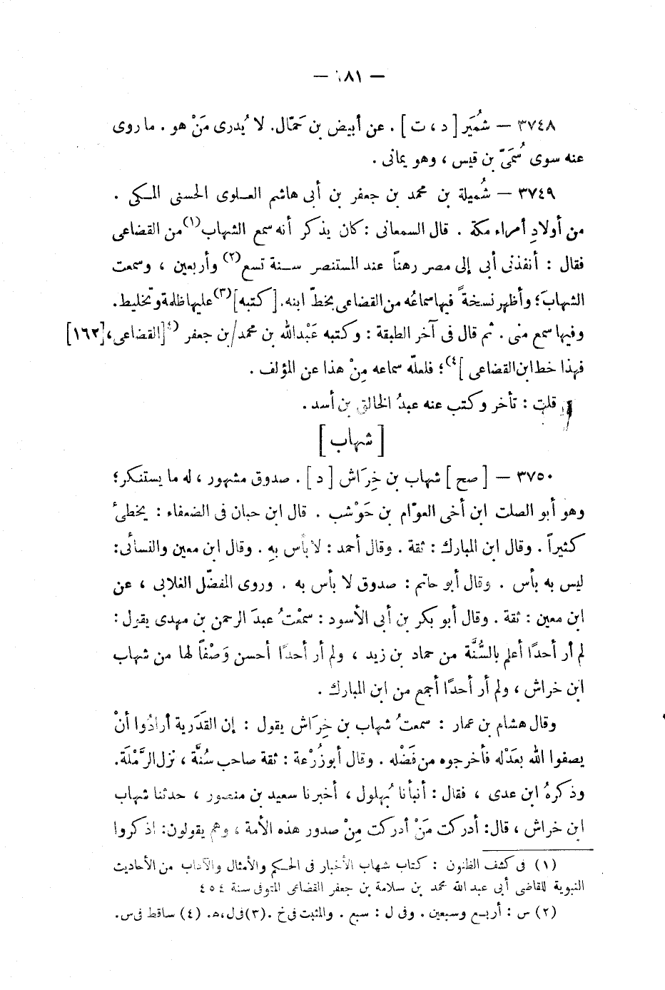 (1) في كشف الطنون: كتاب شهاب الاخبار في الحكم والامثال والاداب من الاحاديث النبوية للقاضي أبي عبد الله محمد بن سلامة بن جعفر القضاعى المتوفى سنة 454 (2) س: أربع وسبعين.