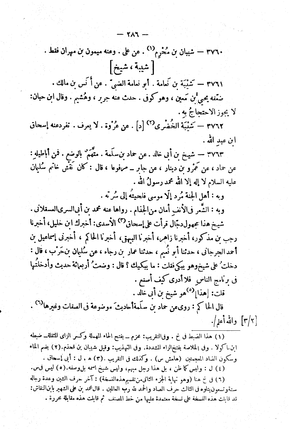 (6) في خ هنا (وهو نهاية الجزء الثاني من تقسيم هذه النسخة) : آخر حرف الشين وعدة رجاله ستة وتسعون يتلوه في الثالث حرف الصاد والحمد لله رب العالمين.