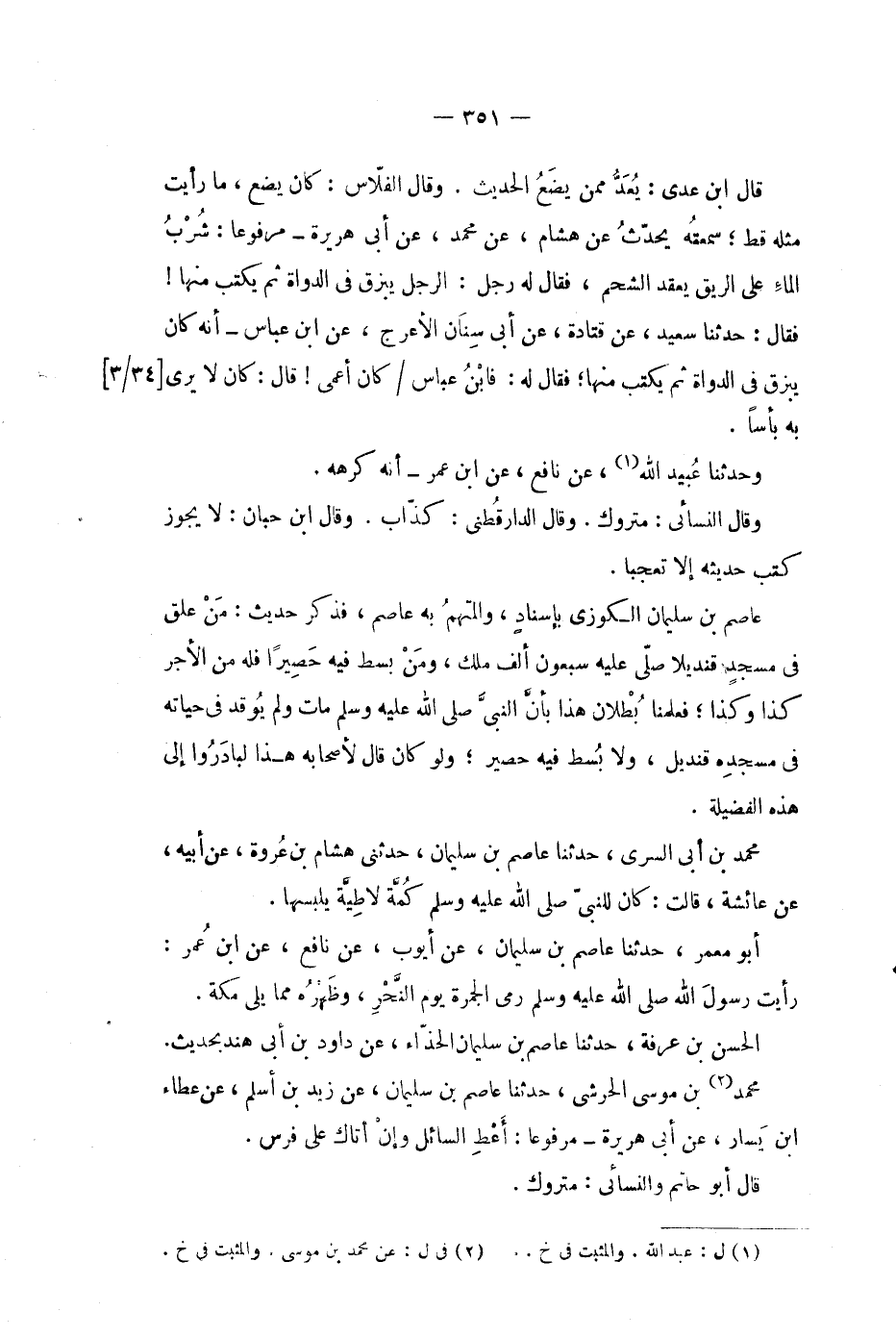 وقال الفلاس: كان يضع، ما رأيت مثله قط، سمعته يحدث عن هشام، عن محمد، عن أبي هريرة - مرفوعاً: شرب الماء على الريق يعقد الشحم، فقال له رجل: الرجل يبزق في الدواة ثم يكتب منها! فقال: حدثنا سعيد، عن قتادة، عن أبي سنان الأعرج، عن ابن عباس - أنه كان يبزق في الدواة ثم يكتب منها، فقال له: فابن عباس / كان أعمى! قال: كان لا يرى [34 / 3] به بأسا.