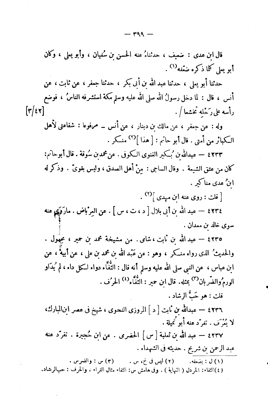 [42 / 3] وله: عن جعفر، عن مالك بن دينار، عن أنس - مرفوعاً: شفاعتي لاهل الكبائر من أمتى.