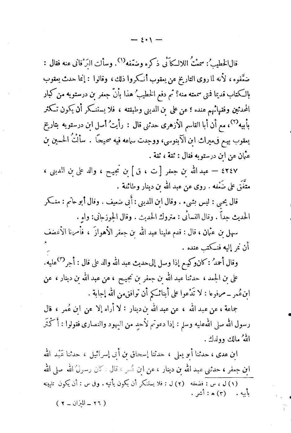 وسألت البرقانى عنه فقال: ضعفوه، لانه لما روى التاريخ عن يعقوب أنكروا ذلك، وقالوا: إنما حدث يعقوب بالكتاب قديما فمتى سمعته منه؟ ثم دفع الخطيب هذا بأن جعفر بن درستويه من كبار المحدثين وفقهائهم عنده، عن علي بن المديني وطبقته، فلا يستنكر أن يكون تكثر بأبيه (2) ، مع أن أبا القاسم الأزهري حدثني قال: رأيت أصل ابن درستويه بتاريخ يعقوب بيع في ميراث ابن الآبنوسى، ووجدت سماعه فيه صحيحا.