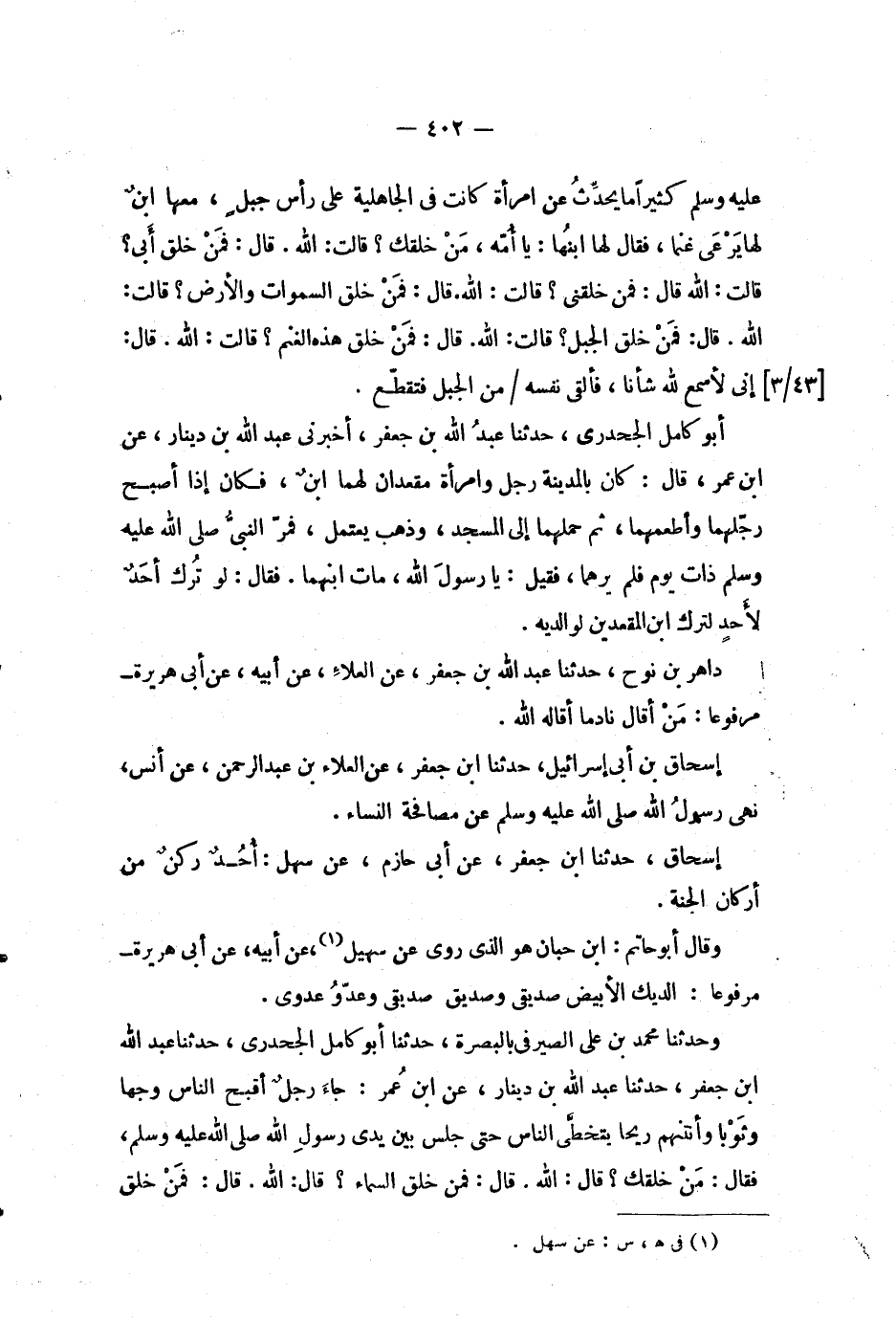 وحدثنا محمد بن علي الصيرفى بالبصرة، حدثنا أبو كامل الجحدري، حدثنا عبد الله ابن جعفر، حدثنا عبد الله بن دينار، عن ابن عمر: جاء رجل أقبح الناس وجها وثوبا وأنتنهم ريحا يتخطى الناس حتى جلس بين يدى رسول الله صلى الله عليه وسلم، فقال: من خلقك؟ قال: الله.