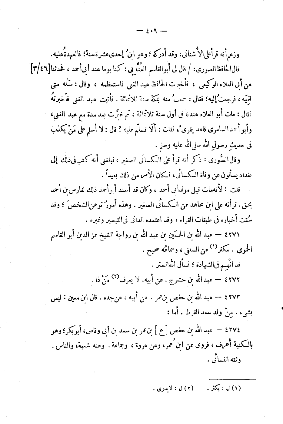 فأتيت عبد الغنى فأخبرته فقال: مات أبو العلاء عندنا في أول سنة ثلاثمائة، ثم غبرت بعد مدة مع عبد الغنى، وأبو أحمد السامري قاعد يقرئ، فقلت: ألا تسلم عليه؟ قال: لا أسلم على من يكذب في حديث رسول الله صلى الله عليه وسلم.
