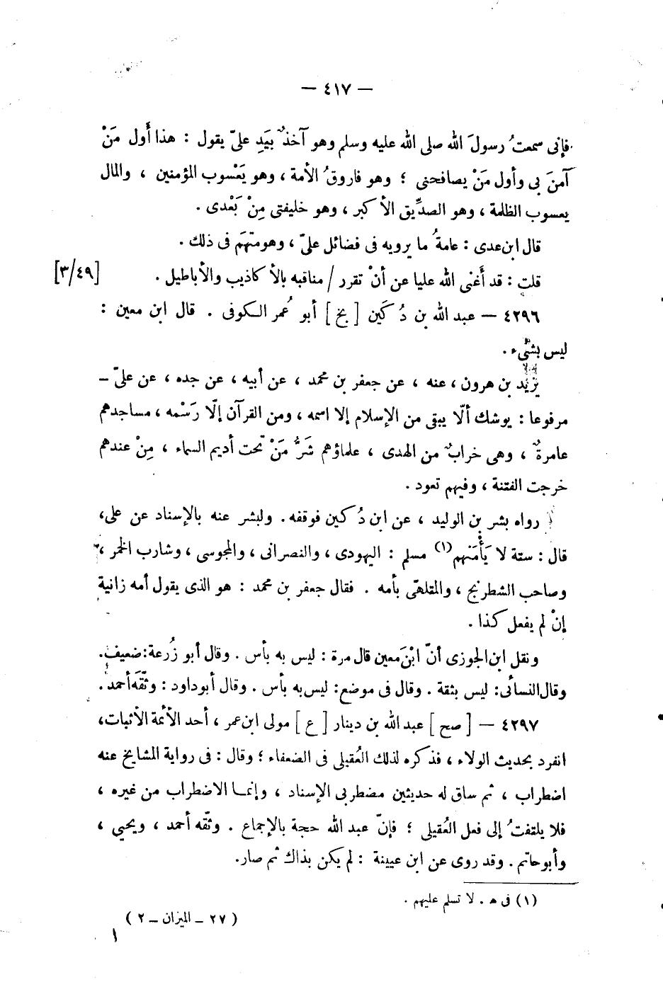 4297 -[صح] عبد الله بن دينار [ع] مولى ابن عمر، أحد الائمة الاثبات، انفرد بحديث الولاء، فذكره لذلك العقيلي في الضعفاء، وقال: في رواية المشايخ عنه