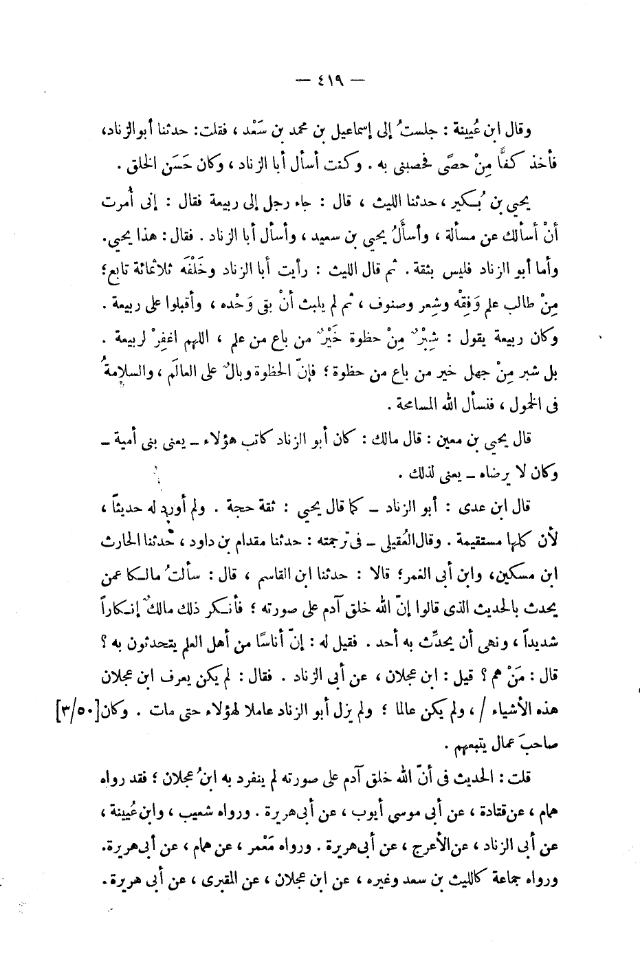 فقيل له: إن أناسا من أهل العلم يتحدثون به؟ قال: من هم؟ قيل: ابن عجلان، عن أبي الزناد.